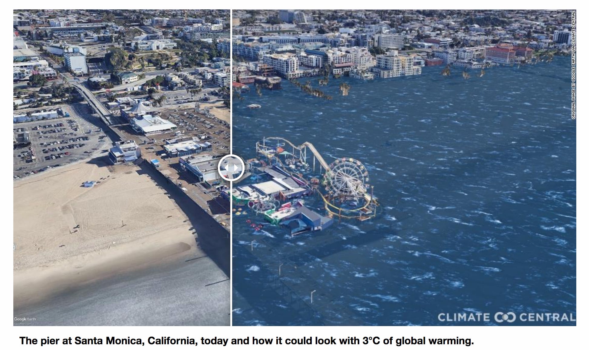 That’s the question these Climate Central images attempt to answer. They take Google Earth images of famous spots from around the world (like the Santa Monica Pier) and then create slider-bar pictures of the same location submerged beneath the rising waters.